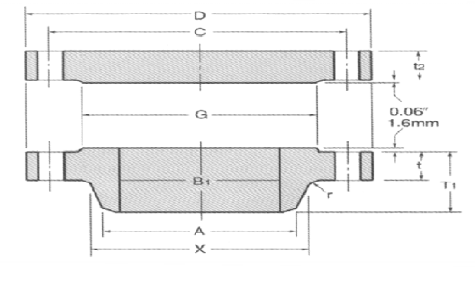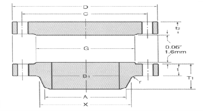 (1) Class 150 flanges will be furnished with 0.06"(1.6mm) raised face which is included in 'Thickness' (t) and 'Length through Hub'(T1).